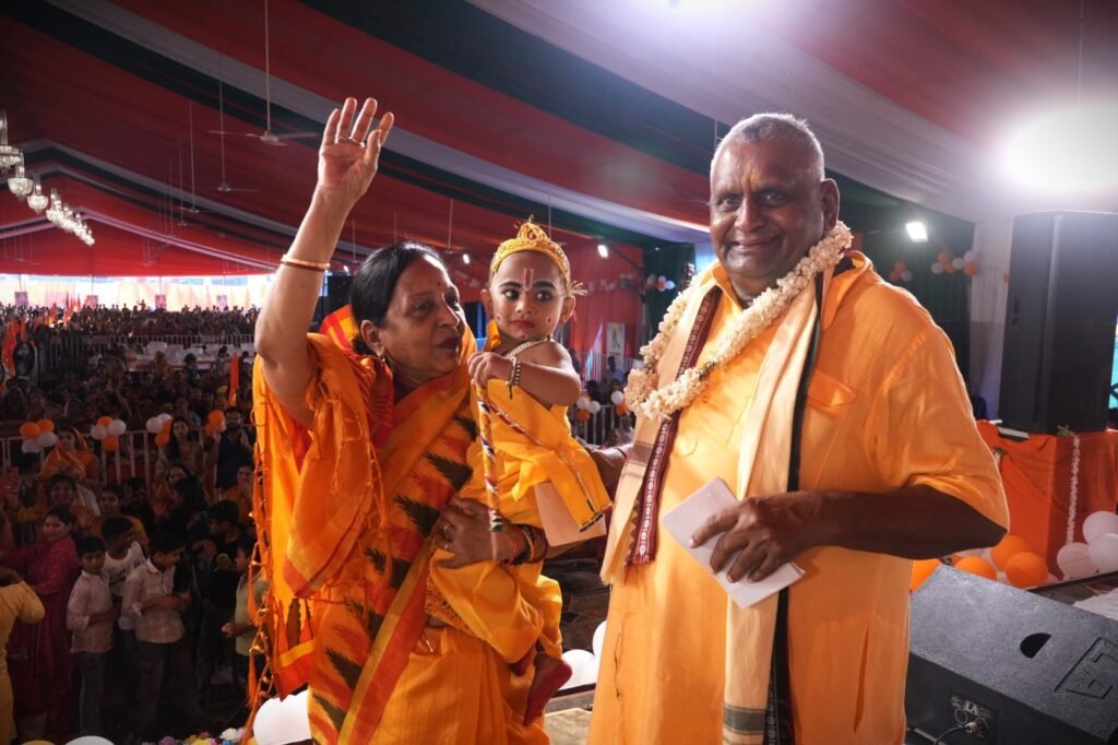 श्रीमद्भागवत कथा का चौथा दिन श्रीकृष्ण जन्मोत्सव की अनुपम छटा से भरा रहा। जैसे ही आचार्य शांतनु जी महाराज ने भगवान कृष्ण के जन्म का प्रसंग सुनाया, पूरा कथा पंडाल “नंद के आनंद भयो, जय कन्हैया लाल की” के जयघोष से गूंज उठा। भक्तगण भावविभोर होकर नाचने लगे और महिलाओं ने मंगल गीत गाए। मंच से पुष्प वर्षा हुई। भक्तों ने इसे साक्षात नंदगांव का नंदोत्सव मान लिया। उसी क्षण का दृश्य और भी अद्भुत हो गया जब आचार्य शांतनु जी महाराज ने बालकृष्ण का रूप धरे एक नन्हे शिशु को अपनी गोद में उठाया और नंदलाल की तरह उसे खिलाने लगे। श्रद्धालुओं की आँखें भक्ति से छलक उठीं और वातावरण पूर्णत: कृष्णमय हो गया।