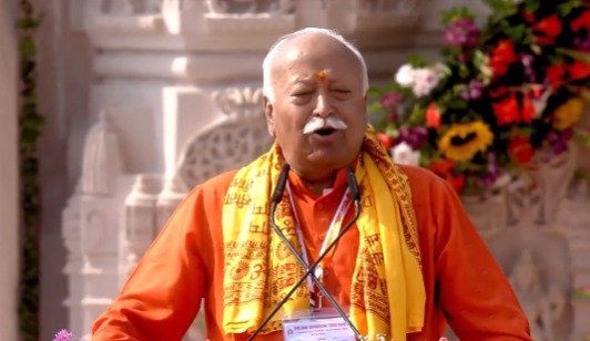 ‘ उन्होंने कहा, ”जो लोग हर दिन पृष्ठभूमि में काम करते थे, उन्होंने भी राम मंदिर का सपना देखा था, अब जब रस्में पूरी हो गई हैं तो ‘राम राज्य’ का झंडा फहराया गया है।” उन्होंने कहा, “इतना ऊंचा ध्वज फहराने में बहुत समय लगा है। आप सब जानते हैं कि मंदिर बनने में कितना समय लगा — अगर 500 साल को छोड़ भी दें, तो 30 साल लगे।” संघ प्रमुख ने कहा कि इस ध्वज के माध्यम से कुछ बुनियादी मूल्यों को ऊपर उठाया गया है। भागवत ने कहा, “ये वो मूल्य हैं जो दुनिया को रास्ता दिखाएंगे — निजी जीवन से लेकर पारिवारिक जीवन और पूरी सृष्टि के जीवन तक। धर्म ही सबकी भलाई सुनिश्चित करता है।” उन्होंने कहा कि झंडे का केसरिया रंग धर्म को दिखाता है और इसलिए इसे ‘धर्म ध्वज’ कहा जाता है।