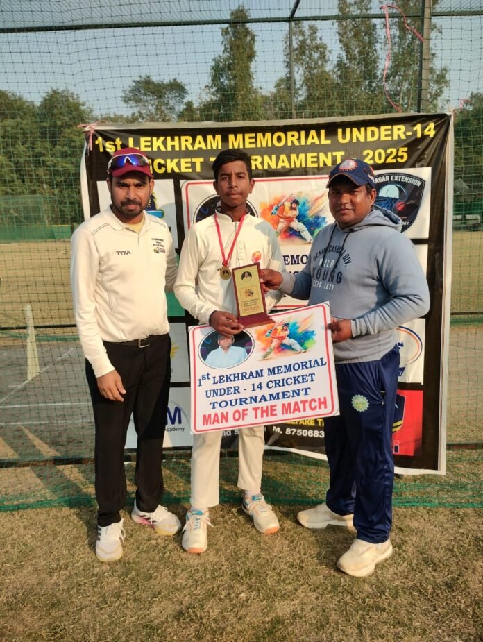 ग़ाज़ियाबाद। प्रथम लेखराम अंडर 14 क्रिकेट टूर्नामेंट का नौवाँ मुकाबला आरसी क्रिकेट अकादमी और एसकेआई 11 के बीच खेला गया । इस मुकाबले में एसकेआई 11 ने पहले टॉस जीतकर गेंदबाजी करने का निर्णय लिया । पहले बल्लेबाजी करते हुए आरसी क्रिकेट अकादमी ने अपने निर्धारित 40 ओवर में नौ विकेट खोकर 240 रन बनाए। विराजकुमार ने 38 रन अंश चौधरी 34 रन अयान त्यागी 28 रन शिवम 29 रन बनाए । वही एसके आई 11 के गेंदबाजों मैं सबसे ज्यादा विकेट अयान को पांच विकेट मिले । नैतिक को 2 विकेट मिले। एसके आई 11 की टीम लक्ष्य का पीछा करते हुए 39 ओवर में चार विकेट से विजय प्राप्त कर लिया। आकृष चौधरी ने रन बनाएं जबकि रुद्राक्ष ने 41 रन बनाए नैतिक ने 65 रनों की मैच विनिंग पारी खेल कर मैन ऑफ द मैच का अवार्ड लिया । गेंदबाजी में आरसी क्रिकेट अकादमी की तरफ से अथर्व और अमन कुमार मयंक यादव अयान त्यागी को एक-एक सफलता मिली।